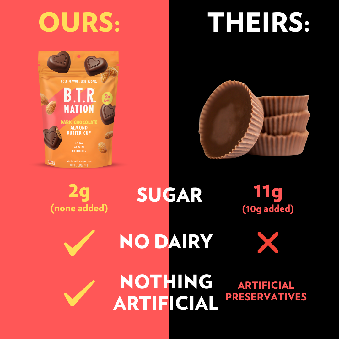 BACK & BETTER THAN EVER! Decadent dark chocolate meets nutty, creamy roasted almond butter. Our Dark Chocolate Almond Butter Cups are back with 2x the filling. Softer and creamier. Rich & indulgent.